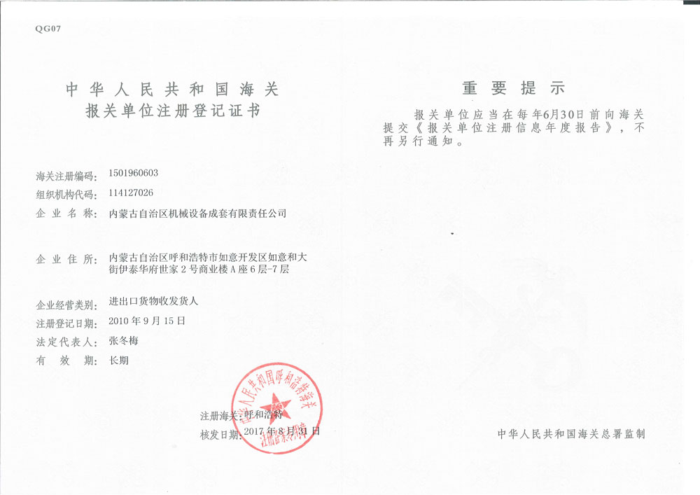 海關(guān)報(bào)關(guān)單位注冊登記證書